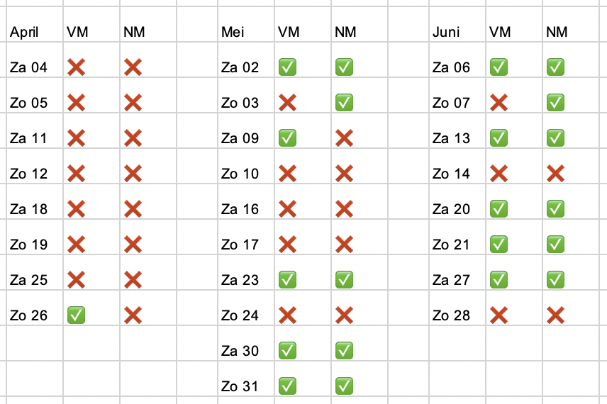 Neem gerust contact op via het contactformulier. Hieronder een overzicht van de nog vrije momenten.